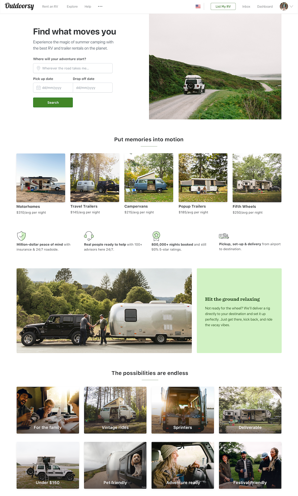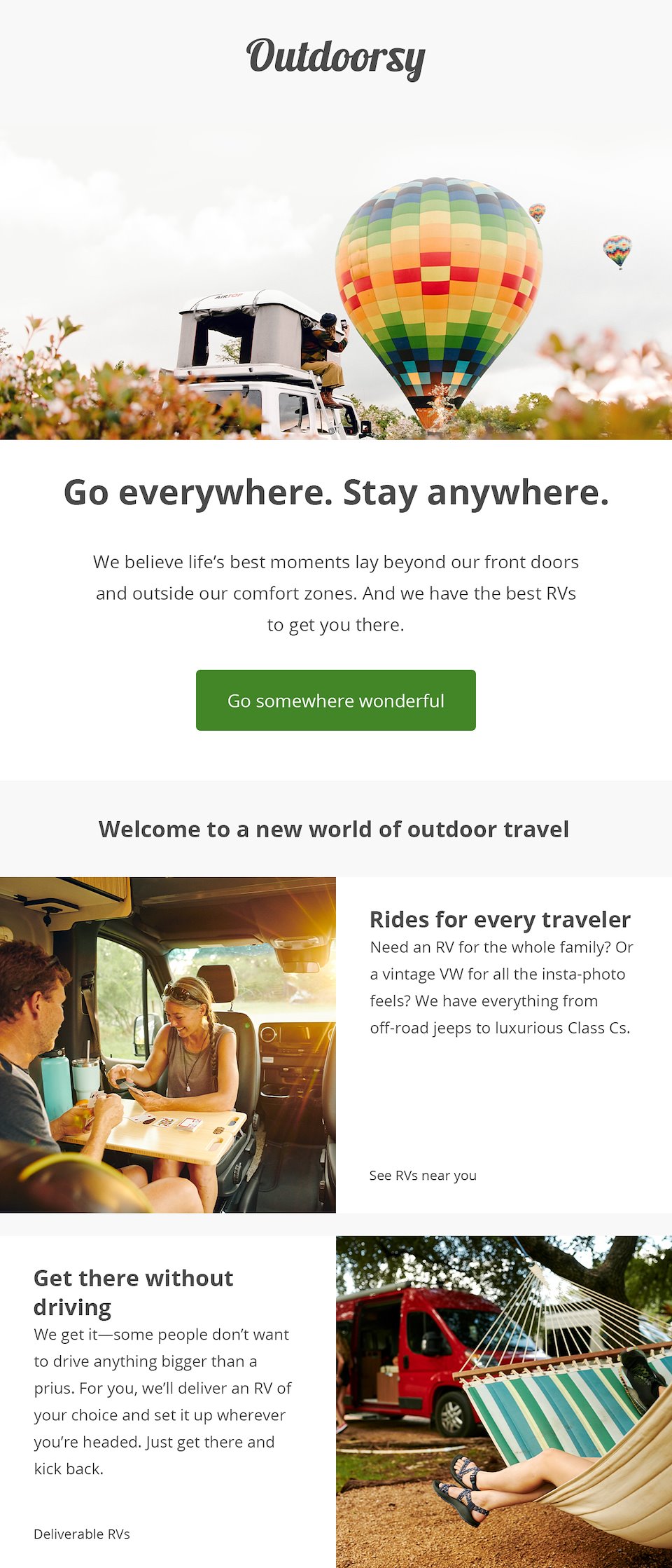 Outdoorsy is an RV rental startup based in Austin. They hired me to rebrand the company and improve day-to-day lifecycle marketing performance with refreshed creative.