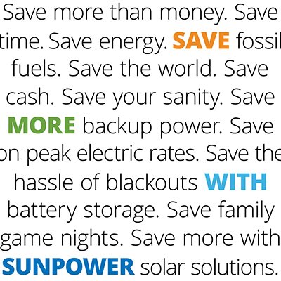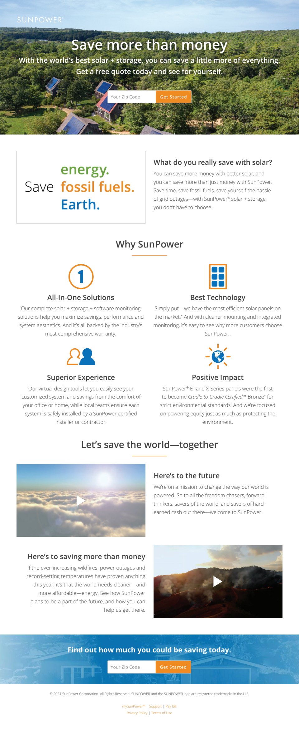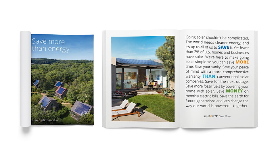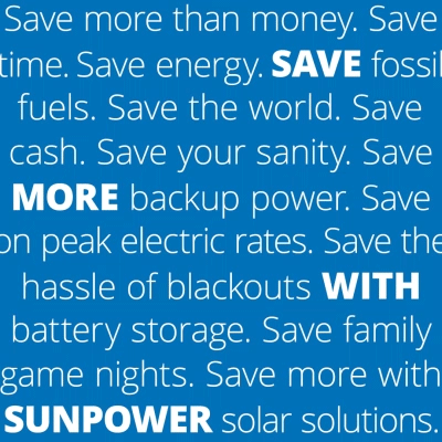 With the solar industry booming in 2021, I was tasked with developing a brand awareness campaign that helped SunPower stand out from the crowd. Which led to the question—what do you really save with solar? True, you can save more money with better solar. But you can save more than just money with SunPower. Save time, save fossil fuels, save yourself the hassle of losing power in a grid outage—with the world’s most efficient solar + storage, you don’t have to choose.